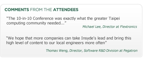 The success of last year's event proved that the Taiwan engineering community is hungry for an opportunity to participate in discussing the current and future landscape of computing technologies. The 10-in-10 Computing Conference provides local engineers, marketers and managers a venue to explore the future of their industry through the perspective of leading technology companies from around the world.