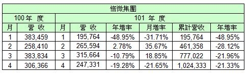 專業半導體通路商倍微科技(6270)今(8)日公佈101年度4月份集團營收(合併大陸子公司)為新台幣2.47億元較101年3月營收3.15億元減少21.65%,較去年同期3.06億減少19.28%。累計今年前4月營收10.24億元較去年同期減少21.33%。