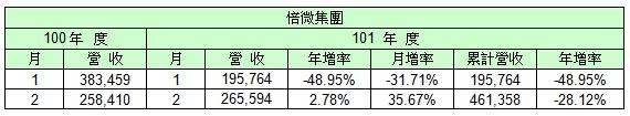 專業半導體通路商倍微科技(6270)今(8)日公佈101年度2份集團營收(合併大陸子公司)為新台幣2.65億元較101年1月營收1.95億元成長35.67%,較去年同期2.58億成長2.78%。累計今年前兩月營收4.61億元較去年同期減少28.12%。