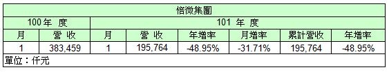 專業半導體通路商倍微科技(6270)今(8)日公佈101年度1月份集團營收(合併大陸子公司)為新台幣1.95億元,較100年12月營收2.86億元減少31.71%,較去年同期3.83億減少48.95%。