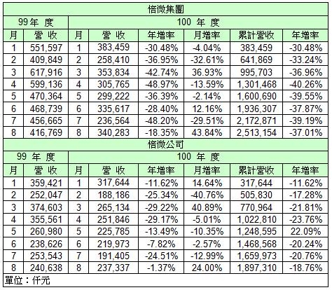 專業半導體通路商倍微科技(6270)今(9)日公佈100年度8月份集團營收(合併大陸子公司)為新台幣.3.40億元,較100年7月營收2.36億元成長43.84%,較去年同期4.16億減少18.35%,累計100年前8月營收25.13億元,較去年同期減少37.01%。
