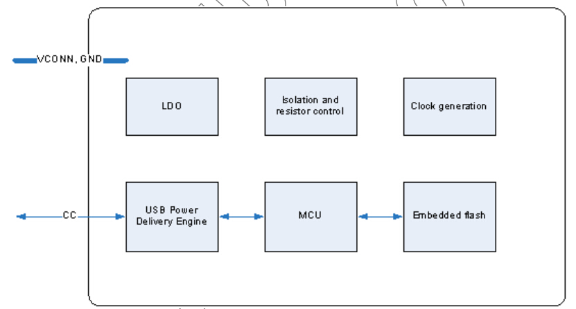 The CH7231 supports the USB Type-C Electronically Marked Cable (E-Marker). The device is designed to follow the USB Type-C Specification 1.1 and the USB Power Delivery Specification Revision 2.0, Version 1.1. The CH7231 is a low cost semiconductor device and can help the cable manufacturer easily enabling the USB Power Delivery feature required by USB Type-C E-Mark cable. In order to reduce the cost of the cable material, The CH7231 integrates all necessary components and circuits, such as LDO, clock generation, isolation circuit, Ra, etc. The on-chip embedded flash allows cable to store VDOs commands specified by the Power Delivery specification that to be used for communication between provider and consumer.