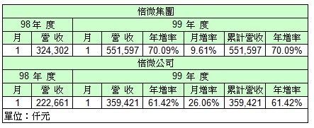 專業半導體通路商倍微科技(6270)今(8)日公佈99年度1月份集團營收(合併大陸子公司)為新台幣5.51億元較98年12月營收5.03億元成長9.61%,較去年同期3.24億元成長70.09%。