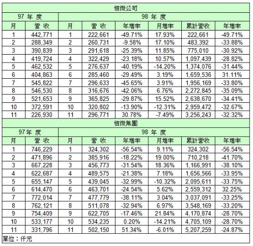 | 專業半導體通路商倍微科技(6270)今(8)日公佈98年度11月份營收,根據內部自行結算為新台幣2.96億元,較98年10月營收3.20億元減少7.49%,較去年同期2.26億元增加30.78%,累計前11月營收32.56億元,較去年同期減少32.32%。同時11月集團營收(合併大陸子公司)為新台幣5.02億元較98年10月營收5.34億元減少6.01%,較去年同期3.31億元增加51.34%,累計前11月集團營收52.07億元,較去年同期減少24.87%。 |