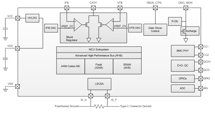 本晶片內建高準度溫度感測器(+/-3度C),可提供MCU系統即時應對過熱環境的調適與保護,並內建140度C的熱當重置電路,確保AC Adapter電路板安全,內建高精度12-bit SAR ADC做電流與電壓感測;內建High Voltage Regulator且支援寬範圍輸入電壓3V~24.5V,省下外部降壓LDO元件成本,內建分流穩壓器(Shunt Regulator),支援Constant Voltage與Constant Current Mode,可透過光耦合器與一次側完成Flyback回授電路。並配合內建高精度11-bit DAC IP,提供寬範圍輸出電壓調變,具10mV,14.6mV,20mV等三種精度設定,輸出電壓範圍達3V~21V,並整合NMOS Gate Driver、電流感測放大器(Current Sense Amplifier)…等眾多功能於同一晶片中,具備完整安全保護機制。