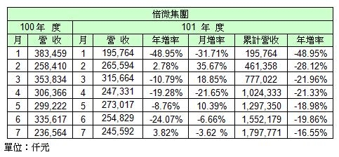 專業半導體通路商倍微科技(6270)今(8)日公佈101年度7月份集團營收(合併大陸子公司)為新台幣2.45億元較101年6月營收2.54億元減少3.62%,較去年同期2.36億成長3.82%。累計今年1-7月營收17.97億元較去年同期減少16.55%。