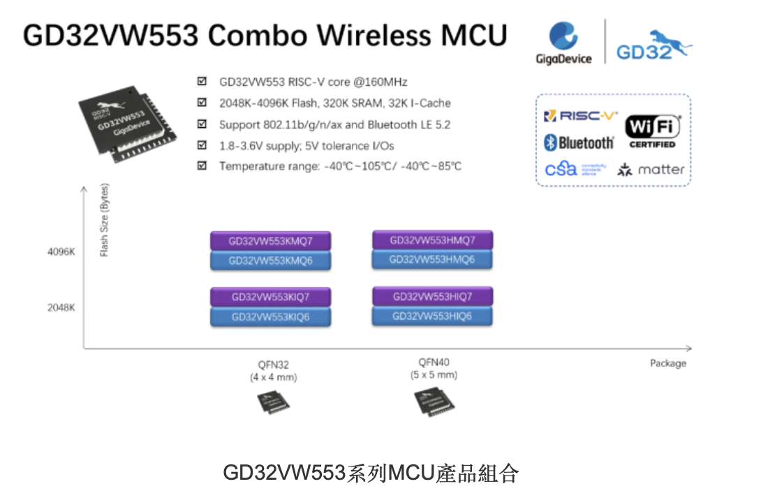 GD32VW553系列MCU支援Wi-Fi 6及Bluetooth LE 5.2無線連接,以先進的射頻集成、強化的安全機制、大型存放區資源以及豐富的通用介面,結合成熟的工藝平臺及優化的成本控制,為需要高效無線傳輸的市場應用持續提供解決方案。全新產品組合提供了8個型號、QFN40/QFN32兩種小型封裝選項,現已開放樣片和開發板卡申請,並將於12月份正式量產供貨。