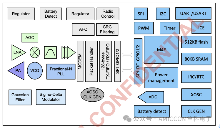 A9146M4的射頻是一種低中頻結構的CMOS FSK/GFSK調變收發晶片,專用於169/315/433/470/868/915MHz ISM頻段的無線應用。此設備特別適用於電池供電的應用,其中包括中國所使用的470MHz~510MHz無線自動抄錶,歐洲169.4MHz/433.8MHz/868.3MHz無線M-bus。另外對於Wi-SUN和IEEE 802.15.4g應用,A9146M4還內置了硬件802.15.4g封包處理和硬件加速的IEEE 802.15.4兼容MAC功能。