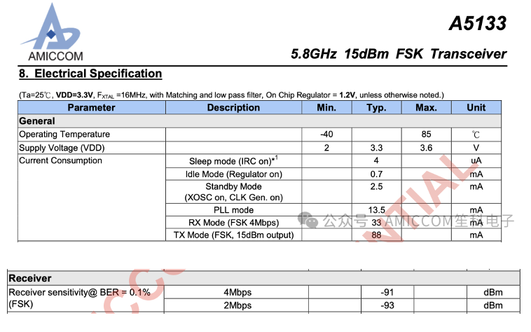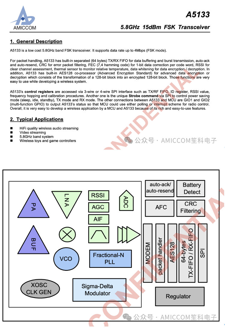 笙科電子的5.8GHz A5133射頻收發器有以下的技術特點: