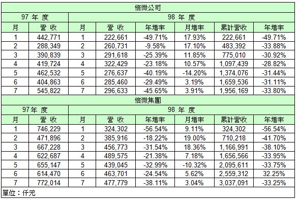 | 專業半導體通路商倍微科技(6270)今(10)日公佈98年度7月份營收,根據內部自行結算為新台幣2.96億元,較98年6月2.85億元增加3.91%,較去年同期5.45億元減少45.65%,累計前7月營收19.56億元,較去年同期減少33.80%。同時7月集團營收(合併大陸子公司)為新台幣4.77億元較98年6月4.63億元增加3.04%,較去年同期7.72億元減少38.11%,累計前7月集團營收30.37億元,較去年同期減少33.25%。 |