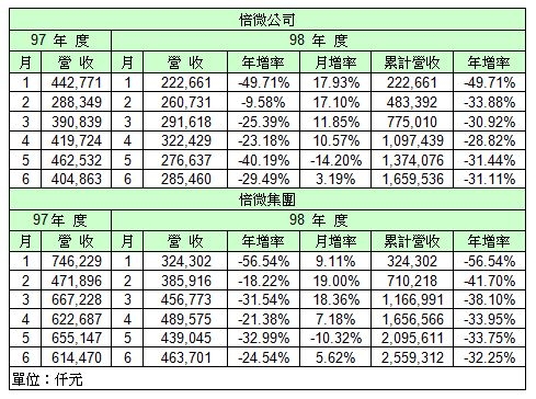 | 專業半導體通路商倍微科技(6270)今(8)日公佈98年度6月份營收,根據內部自行結算為新台幣2.85億元,較98年5月2.76億元增加3.19%,較去年同期4.04億元減少29.49%,累計前六月營收16.59億元,較去年同期減少31.11%。同時6月集團營收(合併大陸子公司)為新台幣4.63億元較98年5月4.39億元增加5.62%,較去年同期6.14億元減少24.54%,累計前六月集團營收25.59億元,較去年同期減少32.25%。 |