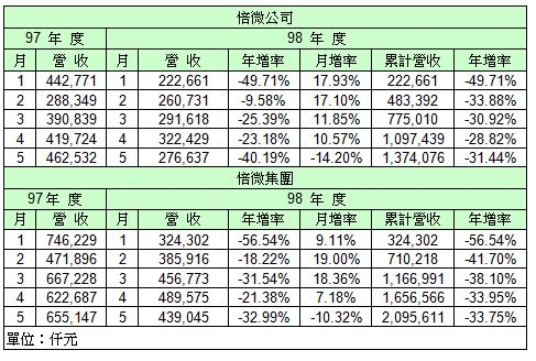 | 專業半導體通路商倍微科技(6270)今(8)日公佈98年度5月份營收,根據內部自行結算為新台幣2.76億元,較98年4月3.22億元減少14.20%,較去年同期4.62億元減少40.19%,累計前五月營收13.74億元,較去年同期減少31.44%。同時5月集團營收(合併大陸子公司)為新台幣4.39億元與98年4月4.89億元減少10.32%,較去年同期6.55億元減少32.99%,累計前五月集團營收20.95億元,較去年同期減少33.75%。 |